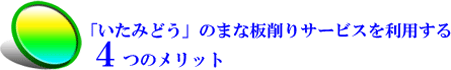 「いたみどう」が提供するまな板削り直しサービスとは、コスト削減・素早い納品・衛生上の悩みをサポート・環境問題への貢献、この4つのメリットをお客様にお届けするサービスです。